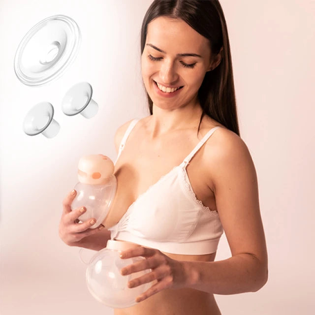 Il set comprende un imbuto base: 28 cm e due riduttori: 21 mm e 24 mm. Grazie a questo, puoi adattare la dimensione dell'imbuto al tuo capezzolo. Queste parti sono realizzate in morbido silicone in modo che non possano irritare la pelle.