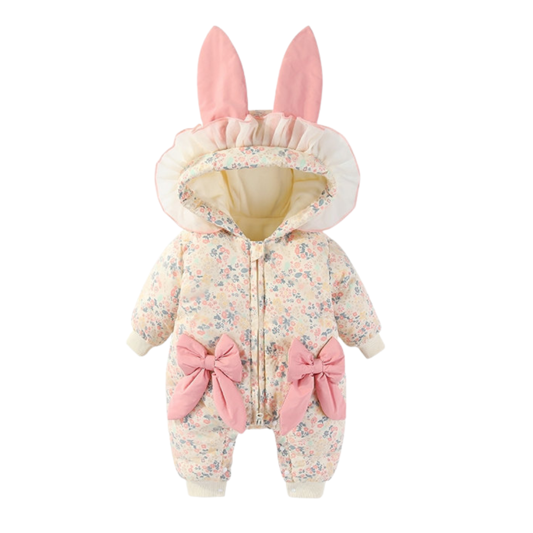 Tuta Imbottita Neonato con Orecchie da Coniglio e Fiocchi Rosa – Invernale Calda