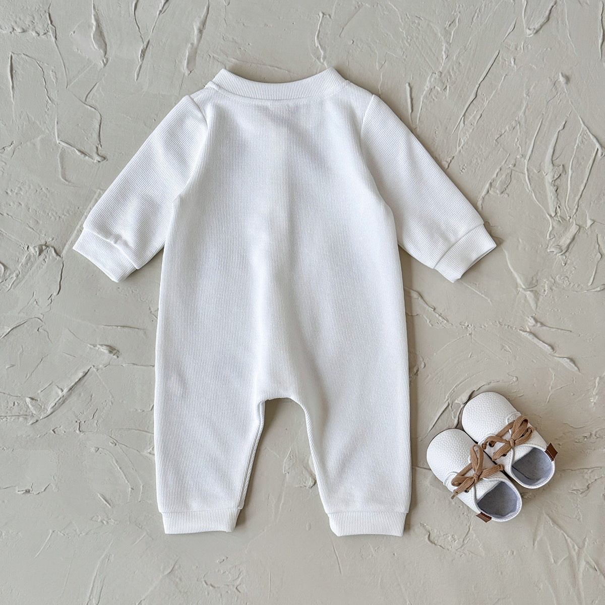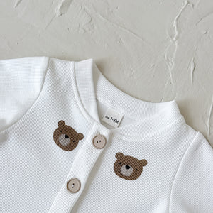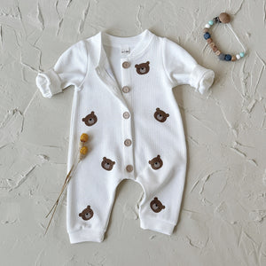Tutina lunga bianca con dolci faccine di orsetto stampate, perfetta per la stagione A/I grazie al tessuto caldo e morbido. La chiusura frontale con bottoncini rende la vestizione semplice e pratica, mentre i polsini elasticizzati assicurano una vestibilità comoda e avvolgente. Ideale per l’uso quotidiano, delicata sulla pelle e super confortevole.