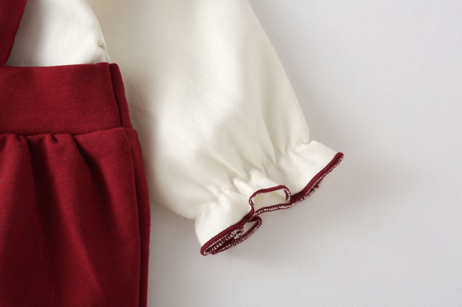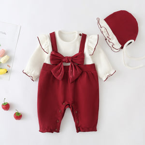 Dolcissimo completo invernale per neonato composto da 3 pezzi: body bianco a maniche lunghe con volant, salopette rossa con grande fiocco frontale e pratici bottoncini sul cavallo, più cappellino coordinato. Realizzato in tessuto caldo e confortevole, è perfetto per mantenere il tuo bimbo al caldo durante i mesi più freddi senza rinunciare allo stile. Un outfit elegante e pratico, ideale per feste, foto ricordo o giornate speciali.