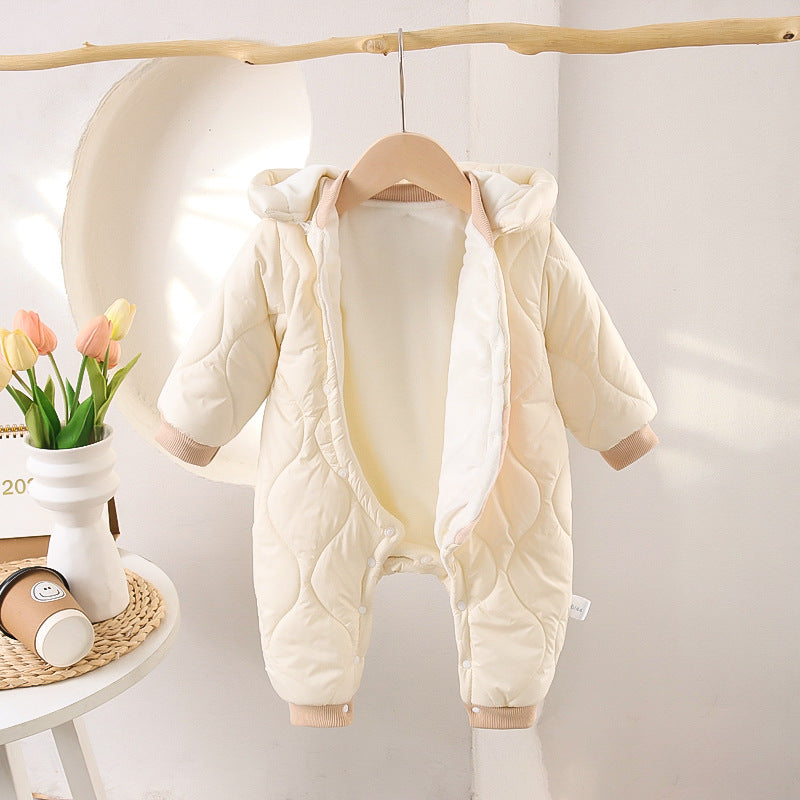 Morbida tutina invernale per neonato con imbottitura calda e rivestimento trapuntato, perfetta per proteggere il tuo bimbo nelle giornate più fredde. Il modello è dotato di cappuccio con interno felpato, chiusura con bottoni a pressione e dolce ricamo orsetto sul davanti.