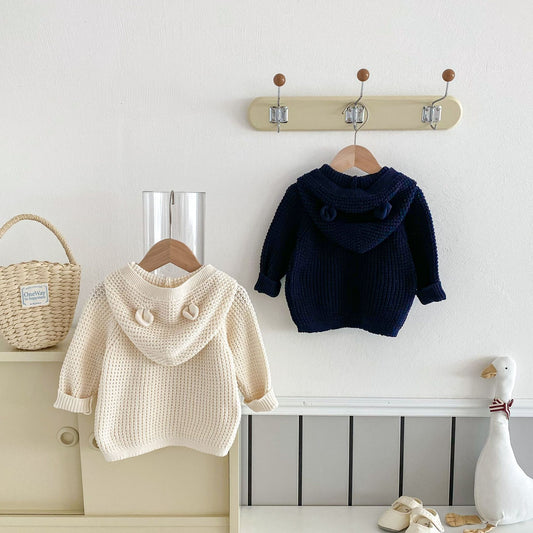 Cardigan Neutro Bimba/ Bimbo con Cappuccio e Orecchie – Maglia Morbida in Cotone