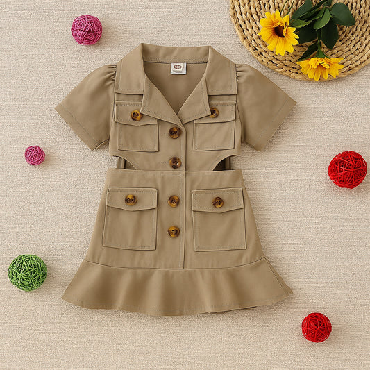 Vestito Bambina Stile Safari con Tasche e Bottoni