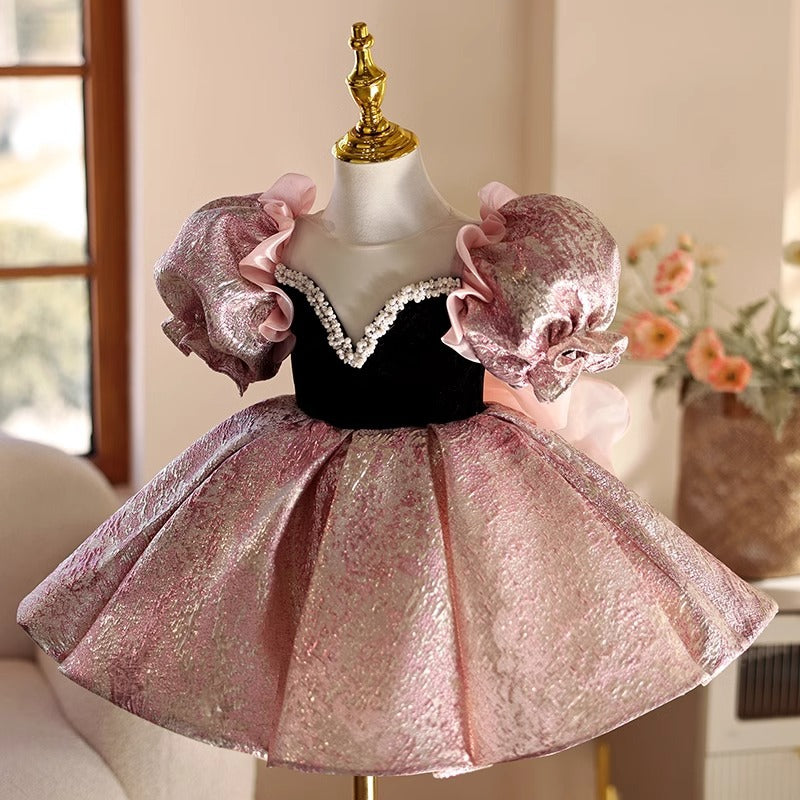 Incanta con eleganza! Questo splendido abito da cerimonia per bambina è perfetto per occasioni speciali come matrimoni, battesimi, compleanni o servizi fotografici. Il corpetto in velluto nero è impreziosito da un’elegante scollatura a cuore bordata di perline, mentre le maniche a palloncino in tulle rosa lilla donano un tocco fiabesco. La gonna ampia e plissettata, realizzata in tessuto lucente, garantisce volume e raffinatezza. Completa il look un grazioso cerchietto coordinato con fiocco.