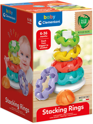 5 anelli colorati, di diversa grandezza, da impilare su una base basculante. Gli anelli sono realizzati con superfici diverse per stimolare la percezione tattile dei bambini fin dai primi mesi di vita. Supporta lo sviluppo della manualità e della percezione visiva. Stimola il bambino al riconoscimento di colori, forme e dimensioni.
