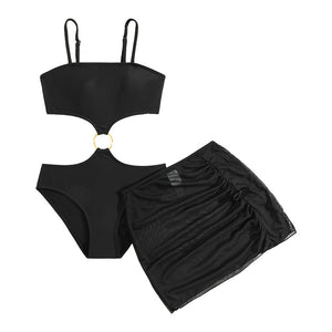 Costume intero con dettaglio anello dorato e gonna in tulle trasparente.