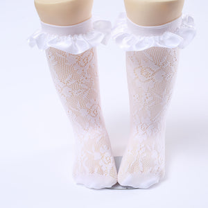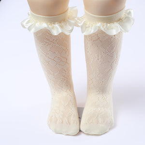 Calze al ginocchio da bambina con raffinata lavorazione traforata e bordo in raso arricciato. Morbide e confortevoli, donano un tocco romantico e chic ad ogni outfit, perfette per cerimonie, battesimi o look eleganti di tutti i giorni.