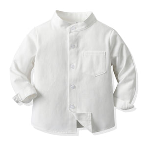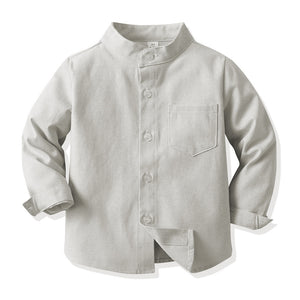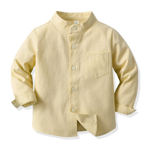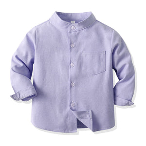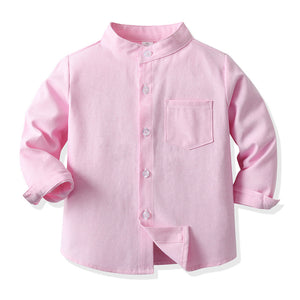 Camicia a maniche lunghe per bambino in stile coreano, realizzata in morbido cotone leggero, ideale per la primavera e l’estate. Dotata di colletto alla coreana e taschino sul petto, si abbina perfettamente a look casual o eleganti. Disponibile in una vasta gamma di colori pastello: azzurro, bianco, lilla, verde menta, grigio chiaro, celeste, rosa, giallo e altri. Pratica chiusura frontale con bottoni.
