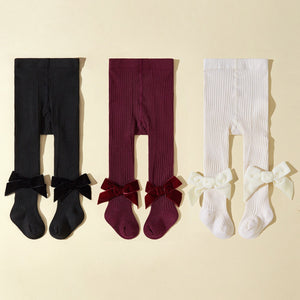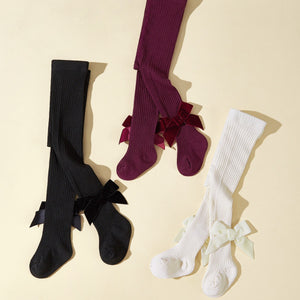 Eleganti collant per bambina realizzati in maglia a costine elasticizzata, arricchiti da un grande fiocco in velluto applicato alla caviglia. Disponibili in tre varianti di colore: