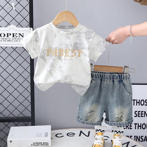 Completo Estivo Bimbo T-shirt “Power” Effetto Marmo e Shorts in Denim
