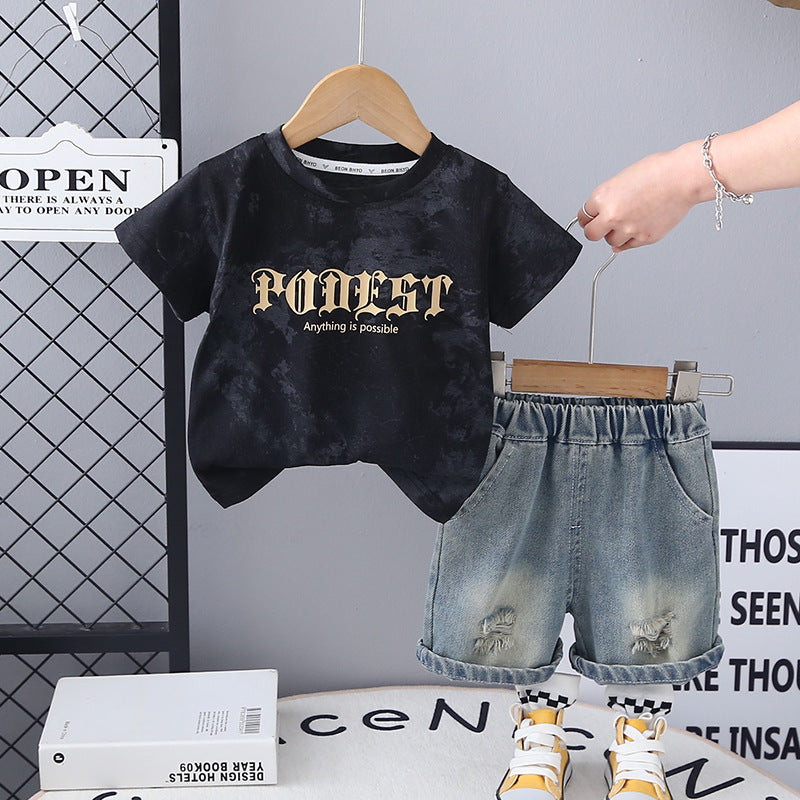 Home Completo Estivo Bimbo T-shirt “Power” Effetto Marmo e Shorts in Denim
