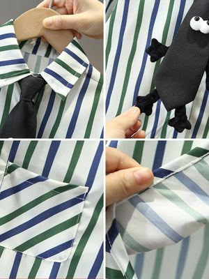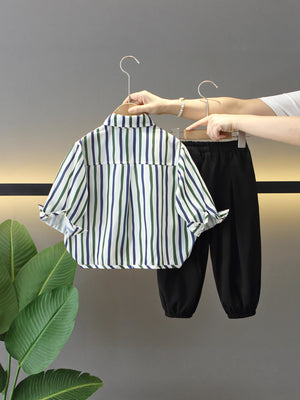 Completo bambino 2 pezzi – Camicia a righe con cravatta giocattolo e pantaloni neri