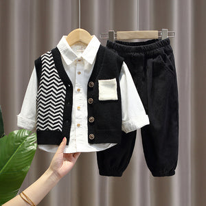 Home Completo bambino con gilet lavorato a maglia, camicia e pantaloni in velluto a coste