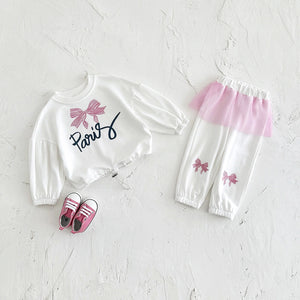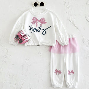Elegante completo composto da felpina bianca con stampa fiocco rosa e scritta “Paris”, abbinata a pantaloni bianchi decorati con fiocchi e dettaglio in tulle rosa delicato in vita. Il tessuto morbido e caldo garantisce comfort quotidiano, mentre il design con tulle aggiunge un tocco romantico e raffinato. Elastico in vita e alle caviglie per una vestibilità comoda e pratica.