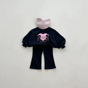 La felpa presenta una tenera stampa con orsetti e cuore e la frase “Good Things Take Time”, per un look dolce ma moderno. Il pantalone a zampa aggiunge un tocco fashion, rendendo questo outfit ideale sia per l’asilo che per il tempo libero.