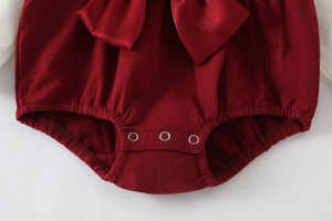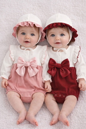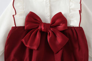 Descrizione: Raffinato completo per bambina composto da un body bianco a maniche lunghe con dettagli in rosso e volant decorativi, abbinato a una parte inferiore in rosso borgogna con un grande fiocco in raso. Il set include un cappello coordinato con volant per un tocco extra di eleganza. Ideale per occasioni speciali come feste, cerimonie o servizi fotografici.