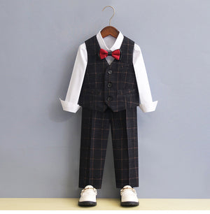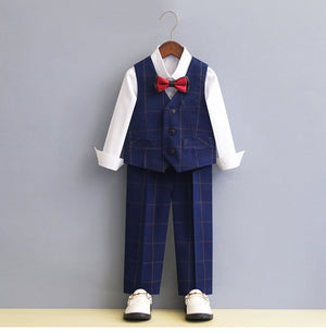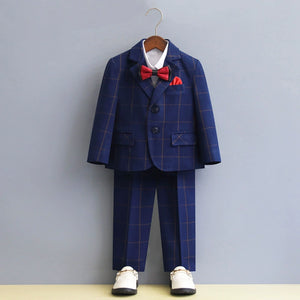 Completo elegante da bimbo ideale per la stagione autunno/inverno. Il set è composto da giacca sartoriale con motivo a quadri, pantalone coordinato, camicia e papillon con pochette abbinata, per un look raffinato e curato nei minimi dettagli.