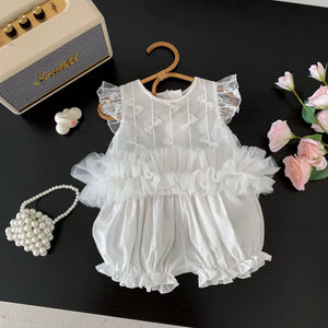 Incantevole set per neonata composto da una blusa bianca in tulle ricamato con dettagli a cuore e maniche in voile, arricchita da una balza arricciata che dona un tocco fiabesco. Gli shorts coordinati con elastico in vita e bordo in tulle completano l'outfit, rendendolo perfetto per battesimi, servizi fotografici o occasioni speciali. Un look raffinato e confortevole che farà risplendere la tua piccola principessa.