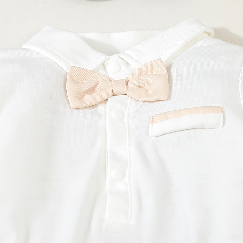Il set include un raffinato body camicia bianco con maniche lunghe e papillon coordinato, pantaloni beige con pratiche bretelle elastiche regolabili, e un elegante cappellino in tinta. Ideale per cerimonie, battesimi, matrimoni o shooting fotografici.