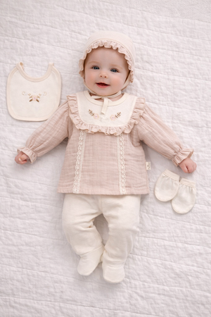Un completo raffinato e delicato, pensato per vestire la tua bambina con dolcezza, eleganza e comfort sin dai suoi primi giorni.