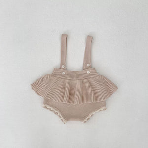 La gonna-salopette beige, anch’essa in morbido cotone, presenta una balza a pieghe che crea un effetto svolazzante e femminile. Le bretelline regolabili con bottoncini permettono una vestibilità pratica e confortevole, mentre la culotte integrata con bordino lavorato offre il massimo del comfort durante il gioco.