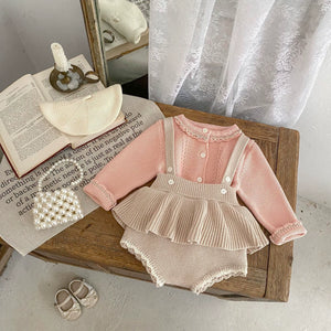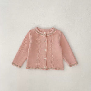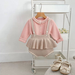 Il set include una maglia rosa lavorata a maglia fine, con bottoncini frontali e un dolcissimo colletto arricciato rifinito con bordo a contrasto. Le maniche e l’orlo presentano una lavorazione più fitta che dona un effetto ricercato e raffinato.