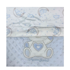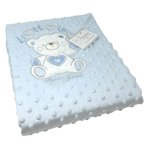 Avvolgi il tuo piccolo in una morbidezza senza pari con questa dolcissima copertina in tessuto minky, caratterizzata da una texture a bolle soffici e un tenero ricamo con orsetto e cuoricini. La scritta Little Love aggiunge un tocco affettuoso, rendendola perfetta per accompagnare il tuo bebè nei suoi momenti di relax e nanna.