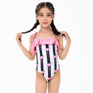 Questo adorabile costume intero da bambina è decorato con una vivace fantasia a righe bianche e nere con fenicotteri rosa e impreziosito da romantici volant rosa sullo scollo.Perfetto per un look frizzante da sfoggiare al mare, in piscina o alle feste estive!