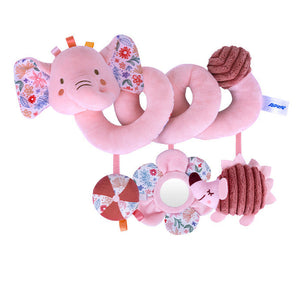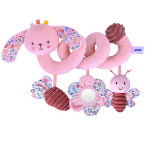 Dolcissima spirale in peluche rosa con simpatico coniglietto o elefantino dalle orecchie fiorate. Include pendenti colorati: fiore con specchietto, ape e sonaglini che stimolano la curiosità e lo sviluppo sensoriale del bambino. Facile da applicare a passeggino, culla o seggiolino.