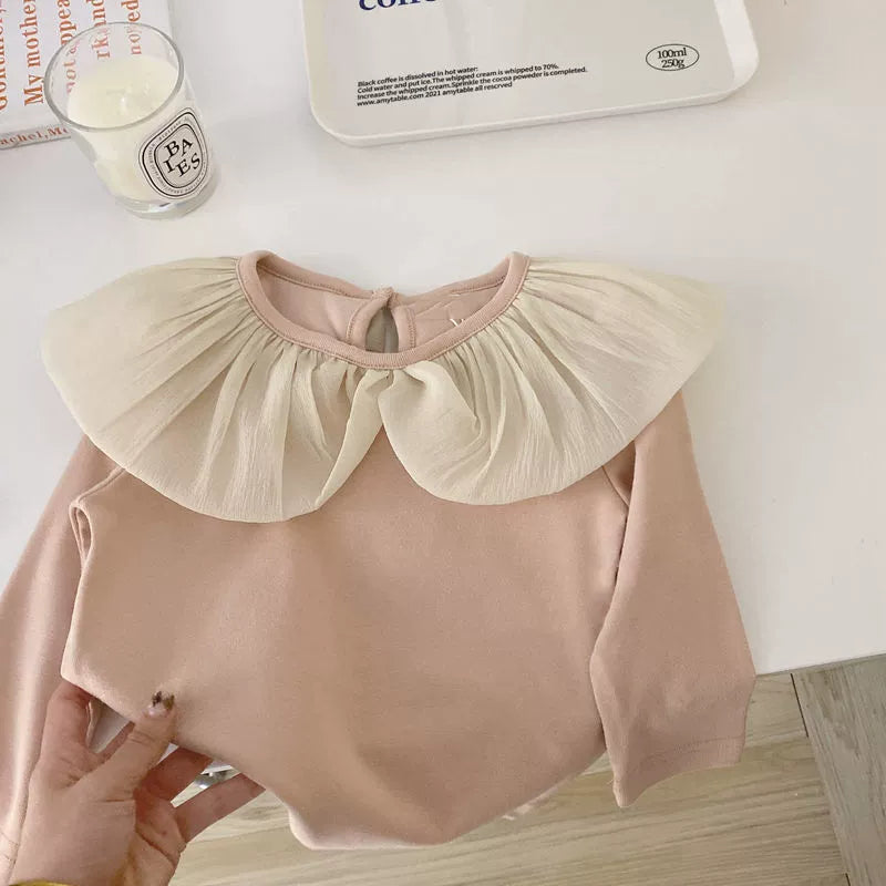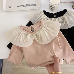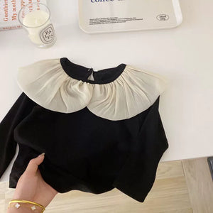 Maglia a maniche lunghe ideale per l’autunno e l’inverno, realizzata in tessuto morbido al 90% cotone, confortevole sulla pelle. Collo arricciato con maxi volant in tulle leggero che dona un tocco elegante e delicato. Apertura posteriore con bottone per una vestibilità pratica. Perfetta per outfit raffinati e giornate più fresche.