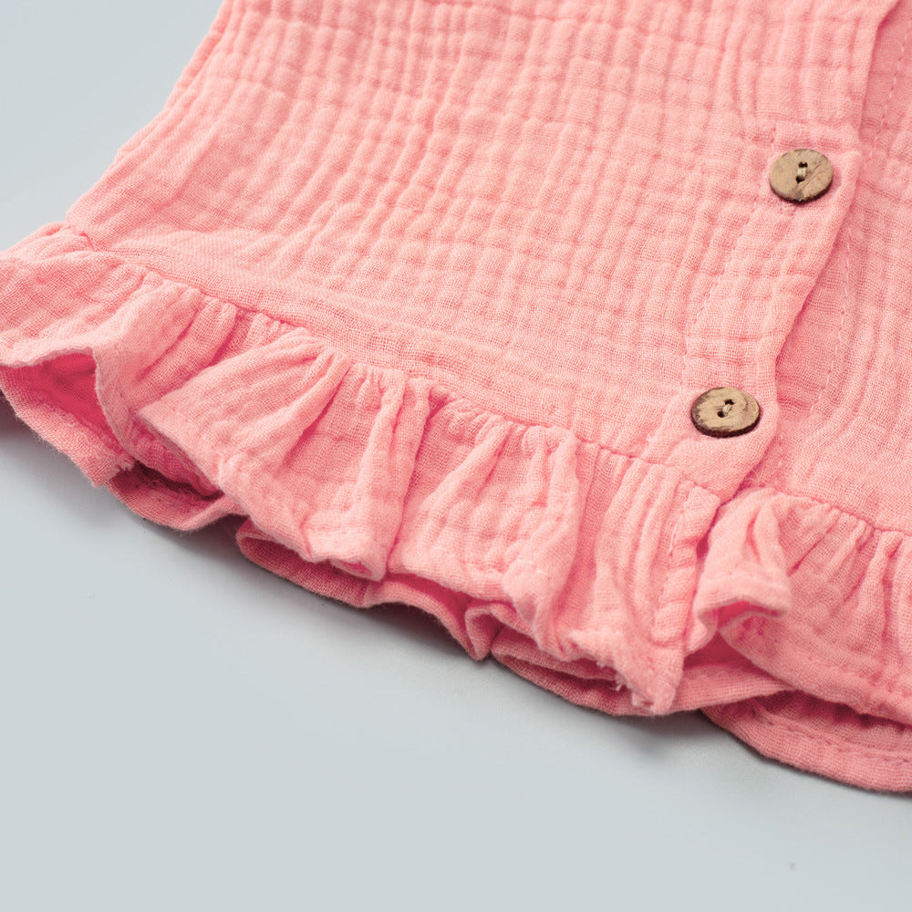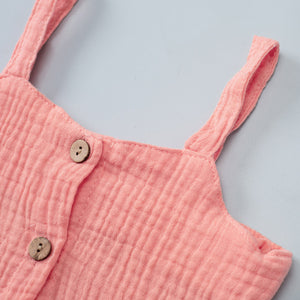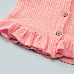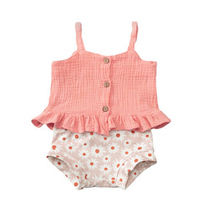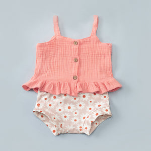 Un outfit estivo irresistibile, perfetto per le giornate di sole! Questo body combina un top in cotone color corallo con bottoncini in legno e un delizioso volant sul fondo, che aggiunge un tocco romantico. La parte inferiore presenta una fantasia floreale con margherite bianche e dettagli arancioni, donando un look fresco e vivace.