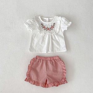 Completo Neonata/ Bimba Ricamato – Top Bianco & Shorts Rosa con Volant