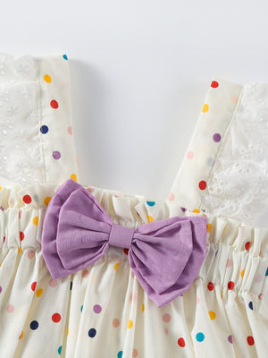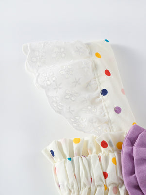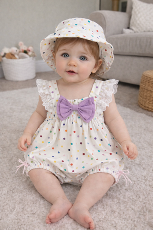Rendi le giornate estive ancora più colorate con questo adorabile completo per neonata! Il set include un body senza maniche con bretelle in pizzo e motivo a pois multicolore, impreziosito da un grazioso fiocco viola. Completa l'outfit un cappellino coordinato per proteggere la tua piccola dal sole con stile. Perfetto per passeggiate, picnic e scatti fotografici indimenticabili! 🌞🎀✨