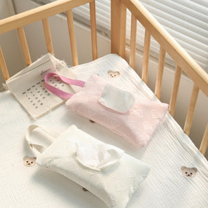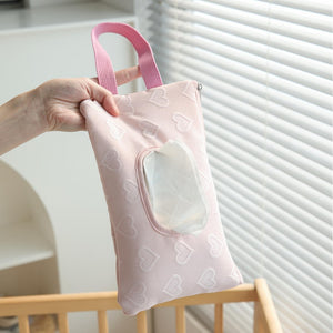 Un pratico porta salviette studiato per mamme e bambini, ideale per avere sempre a portata di mano le salviettine umidificate. Realizzato in tessuto resistente e lavabile, presenta un design dolce con cuori in rilievo e comoda apertura frontale richiudibile. Il manico con cinturino permette di appenderlo facilmente al passeggino, al lettino o alla borsa.