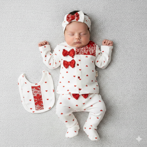 Set 5 pezzi Neonata/ Bimba con Dettagli in Pizzo e Cuoricini Rossi in Cotone