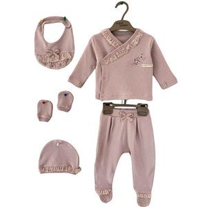 Raffinato set nascita per neonata disponibile in due delicate varianti colore: beige e rosa antico. Il completo include una giacchina con chiusura incrociata, impreziosita da ruches e un dolce ricamo floreale, pantaloni con piedini e fiocchetto decorativo, un cappello coordinato con bordo arricciato, un bavaglino con fiocco e ruches e guantini abbinati. Realizzato in morbido cotone per il massimo comfort della tua piccola. Un'idea regalo perfetta per un look romantico