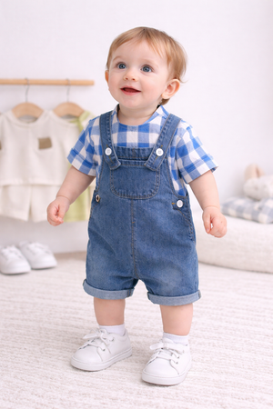 Regala al tuo bimbo uno stile adorabile e comodo con questo completo estivo! Il set include una salopette in jeans morbido con bretelle regolabili e bottoni bianchi, abbinata a una camicia a maniche corte con fantasia a quadri blu e bianchi. Perfetto per le giornate all’aperto, il gioco o una passeggiata in famiglia, questo outfit unisce praticità e moda. Ideale per bambini da 6 a 12 mesi.