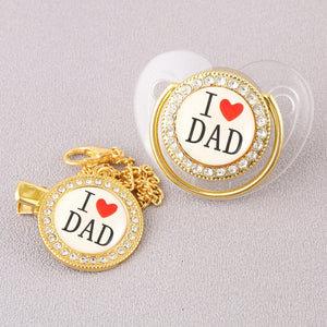 Un set tenero e raffinato composto da ciuccio, catenella coordinata e copri-polvere, con la scritta “I ❤️ Dad” al centro circondata da cristalli scintillanti.