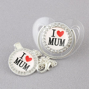 Un set dolce e raffinato composto da ciuccio, catenella coordinata e copri-polvere, decorato con la scritta “I ❤️ Mum” incorniciata da cristalli scintillanti.