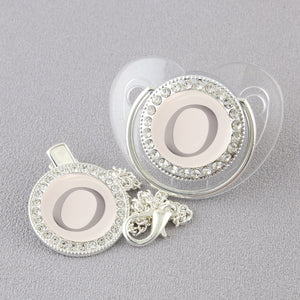 Un accessorio unico e raffinato per il tuo bambino: ciuccio con catena coordinata decorato con cristalli luminosi e l’iniziale personalizzata.