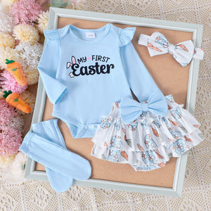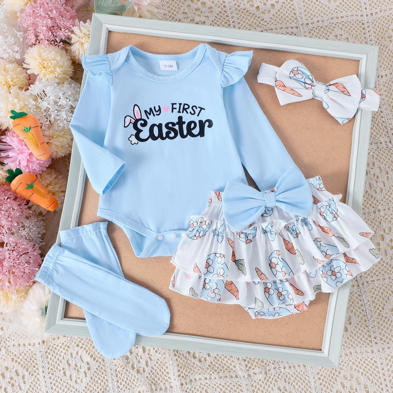 Regala al tuo bebè un look irresistibile con questo set primaverile a tema coniglietto! 🐰✨ Perfetto per Pasqua, servizi fotografici o semplicemente per un’uscita speciale, questo outfit è un mix perfetto di dolcezza e comfort. Il body bianco a maniche lunghe presenta un tenero coniglietto ricamato con una carota, mentre la gonnellina a balze è decorata con una simpatica fantasia di coniglietti e carotine. Il set è completato da un paio di calzine arancioni e un adorabile fiocco per capelli abbinato, per un tocco di stile unico!