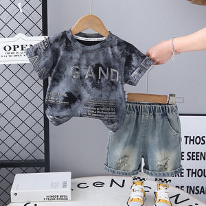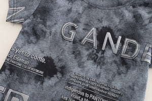 Perfetto per un look streetwear estivo! Questo completo da bambino include una t-shirt dal design tie-dye con scritta "GAND" e dettagli grafici d’impatto, abbinata a shorts in denim chiaro con effetto strappato e risvolto. Un mix ideale di stile e praticità per le giornate calde. Disponibile in due varianti colore: nero/grigio e bianco/grigio.