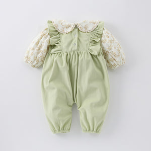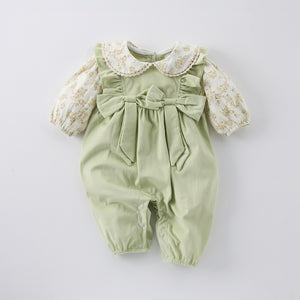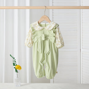 Romantica tuta intera per neonata in delicato verde salvia, con maniche a sbuffo in tessuto floreale panna e colletto ricamato effetto pizzo. Il capo è arricchito da due fiocchi frontali per un tocco raffinato e femminile.
