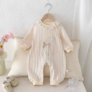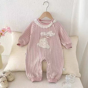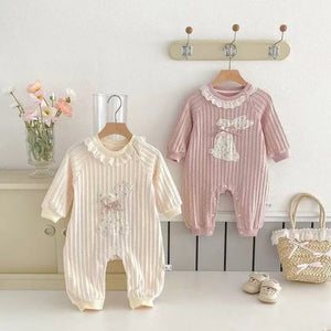 Morbida tutina in maglia a costine per neonata, disponibile nei delicati colori panna e rosa. Caratterizzata da un tenero coniglietto ricamato sul davanti e impreziosita da un fiocchetto in raso e un elegante colletto in pizzo. Le maniche lunghe e i polsini elasticizzati garantiscono comfort e calore, rendendola perfetta per le giornate più fresche. Ideale per l’uso quotidiano, ma anche per occasioni speciali grazie al suo stile raffinato.