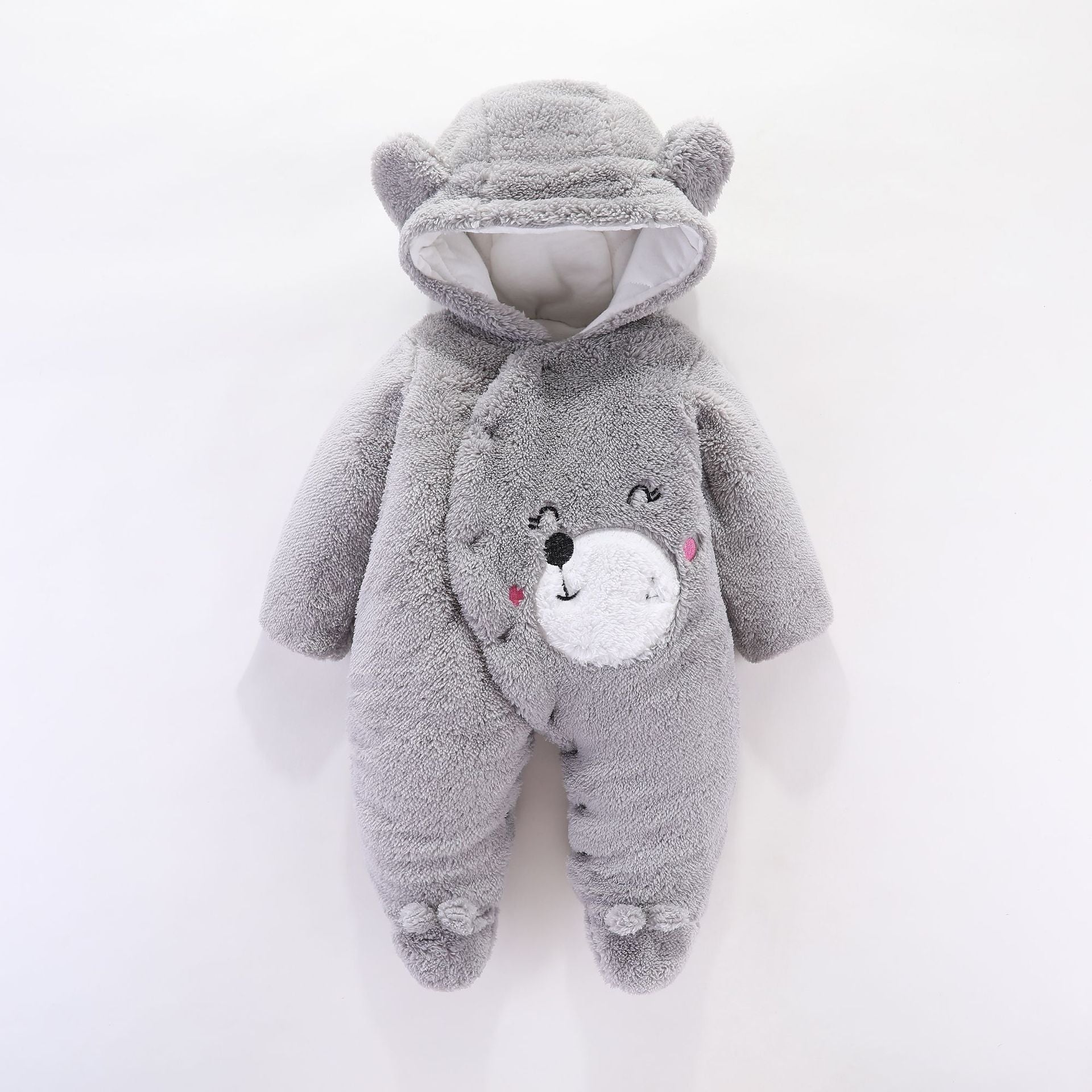 Dolcissime tutine in pile effetto peluche con cappuccio e orecchiette, ideali per tenere il tuo bimbo al caldo durante i mesi più freddi. Il design con visino ricamato aggiunge un tocco tenero e irresistibile, perfetto per ogni occasione.