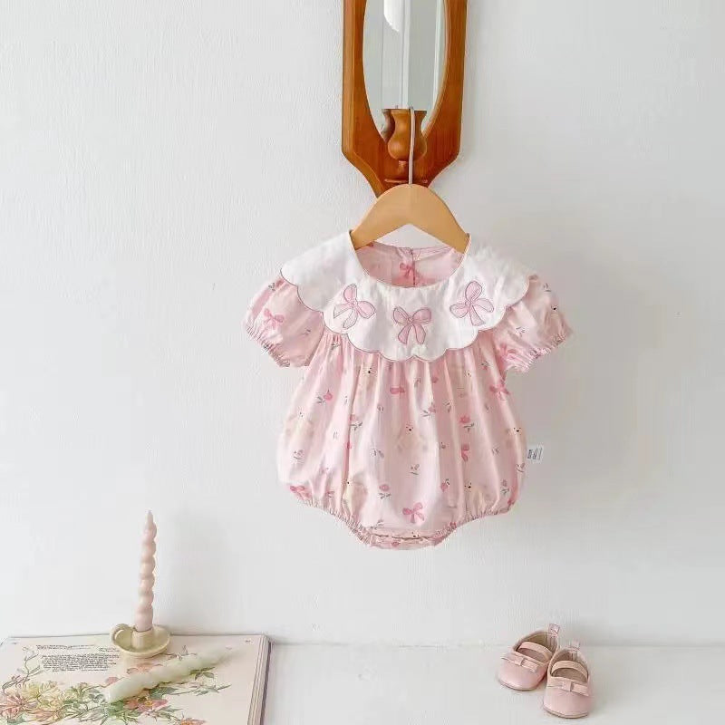 Dolcissima tutina estiva per neonata in tessuto leggero rosa pastello, decorata con una delicata stampa di fiocchetti e orsacchiotti. Il grande colletto bianco è impreziosito da ricami rosa a forma di fiocco, per un tocco tenero ed elegante. Le maniche a sbuffo e gli elastici su gambine e fondo garantiscono massimo comfort e libertà di movimento. Chiusura con bottoncini sul retro e automatici sul fondo per un cambio rapido.