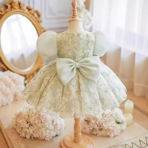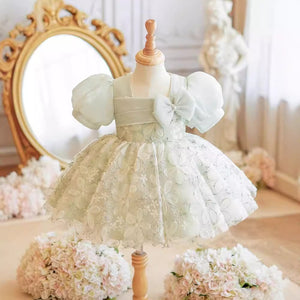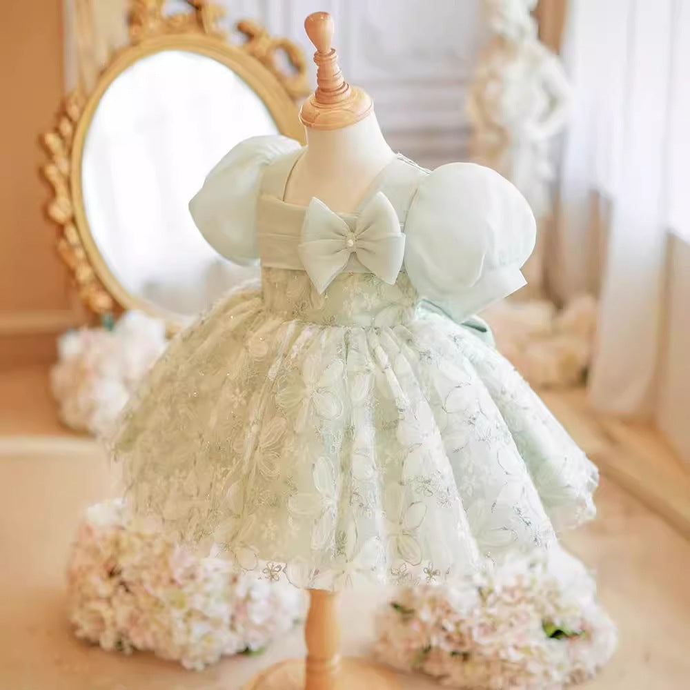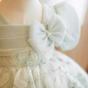 Delizioso abito da cerimonia per bambina in elegante verde salvia, perfetto per battesimi, matrimoni e occasioni speciali. Il corpetto presenta maniche a palloncino e una fascia con fiocco decorativo sul petto, mentre la gonna ampia è arricchita da un raffinato strato di tulle con ricami floreali in rilievo. L’effetto principesco è esaltato dalla morbidezza del tessuto e dalla cura nei dettagli. Un abito romantico e raffinato per far sentire ogni bimba una vera principessa