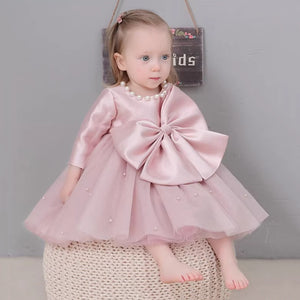 Un vestito da sogno per le piccole principesse! Questo abito da cerimonia color rosa cipria è realizzato con corpetto in raso lucido e gonna in tulle a più strati, impreziosita da perline applicate. Il grande fiocco frontale in raso dona un tocco scenografico ed elegante, perfetto per battesimi, compleanni o occasioni speciali. Collo decorato con perle e maniche a tre quarti completano il look raffinato. Un capo elegante e incantevole, ideale per creare ricordi indimenticabili.
