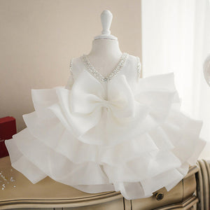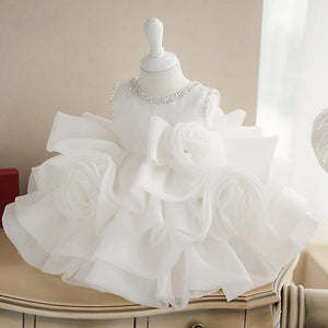 legante abito da cerimonia per neonata in candido bianco, perfetto per battesimi, prime comunioni o eventi speciali. Il design sofisticato presenta una gonna a balze in organza arricchita da maxi rose applicate, che donano movimento e un tocco fiabesco. Il corpetto è rifinito con delicati strass lungo il girocollo e le spalline, per un tocco di luce e raffinatezza. Realizzato con tessuti morbidi e di qualità, garantisce comfort e stile per le più piccole protagoniste. Un vestito da sogno che lascia il segno.
