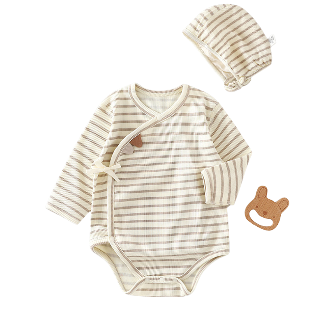 Comfort, delicatezza e stile per i più piccoli! Questo set di 3 body a manica lunga è realizzato in morbido cotone traspirante, ideale per la pelle sensibile del neonato. Ogni body presenta una fantasia diversa in tonalità neutre: luna, stelle e righe, con pratici bottoncini a pressione per facilitare il cambio. Le chiusure laterali a incrocio rendono il capo ancora più comodo da indossare.